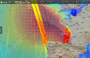 Entre le 9 et le 20 février, plusieurs satellites altimétriques ont mesuré, au large de la France, des vagues d’une hauteur significative dépassant les 7 mètres, atteignant parfois des pics de 9,7 mètres. Contrairement aux altimètres nadir, l’instrument KaRIn sur le satellite SWOT dispose de deux fauchées de 60 km de large chacune. Cette spécificité permet d’obtenir une vision en deux dimensions de la surface océanique, facilitant ainsi l’observation de structures complexes et le calcul des directions de propagation des champs de vagues.