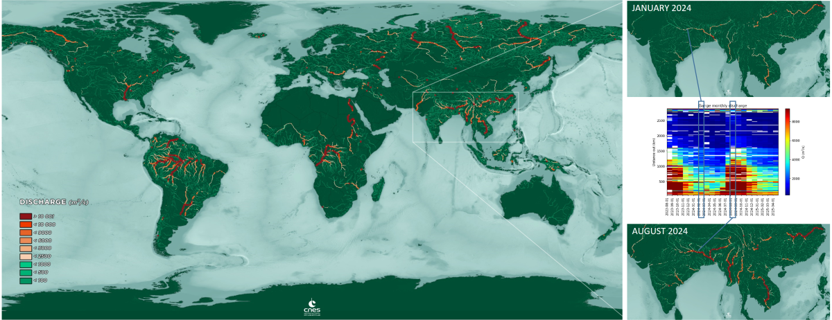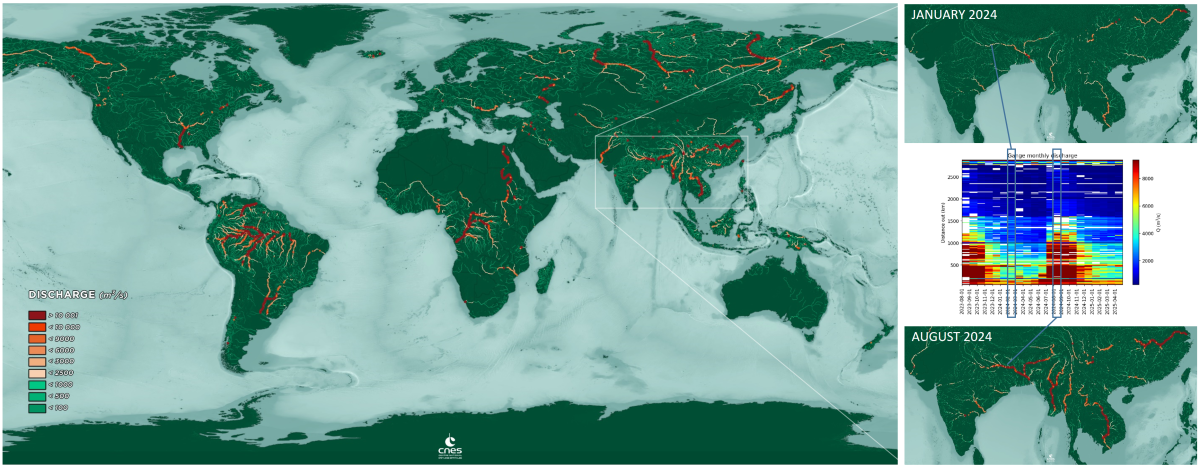 La mission spatiale SWOT, développée conjointement par le CNES et la NASA, , avec des contributions de l’Agence spatiale canadienne (CSA) et de l’Agence spatiale du Royaume-Uni (UKSA), permet désormais d’estimer le débit des fleuves dans le monde, à chacun des passages du satellite. Cette capacité repose sur l’instrument KaRIn et sur des algorithmes innovants, capables de produire des observations hydrologiques globales.