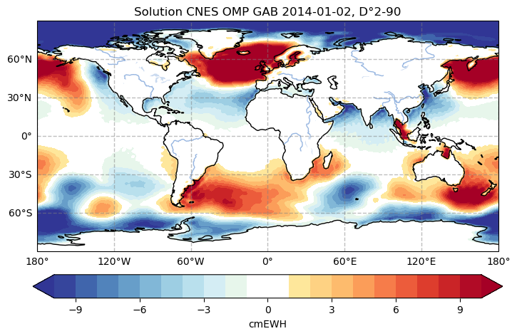 Le calcul du modèle de désaliasing océanique a été effectué par Florent Lyard (LEGOS/CNRS)La réponse de la Terre solide à ce potentiel océanique variable dans le temps a été prise en compte grâce à l’utilisation des nombres de Love kp (Gégout P., article en préparation). Les modèles de dealiasing à 10 jours sont obtenus en moyennant les produits à 3h, prenant en compte le découpage des arcs utilisés pour la production des solutions du géopotentiel. Un exemple de modèle de dealiasing à 10 jours est montré dans la figure 1.