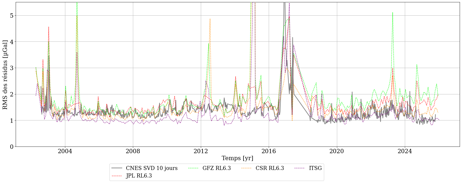 - Lemoine, J.-M., Bourgogne, S., Gégout, P., Reinquin, F., Marty, J.-C., Mercier, F., Loyer, S., Bruinsma, S., & Balmino, G. (2026). 22 years of time-variable gravity field determination from GRACE and GRACE Follow-On : The CNES/GRGS RL05 solution. Journal of Geodesy, 100(2), 20. https://doi.org/10.1007/s00190-026-02040-1