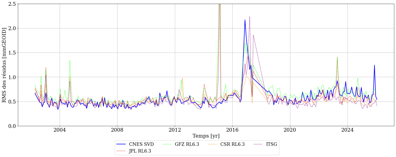 Le bruit des solutions SVD est particulièrement faible par rapport à celui d’autres solutions provenant d’autres centres (JPL, GFZ, CSR, ITSG), qui, bien que non contraintes, nécessitent un filtrage par DDK pour réduire le bruit.